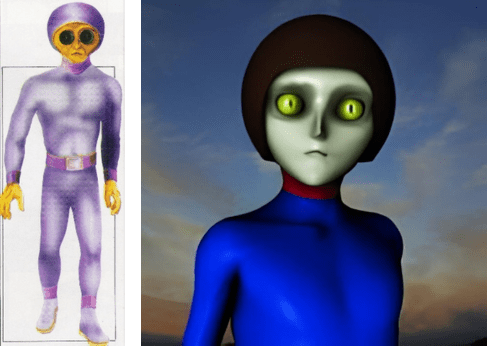 Ao lado do objeto havia 2 homenzinhos de 1 metro de altura que vestiam macacões azuis-escuros, com punhos, cinto e colarinho de cor vermelha. Havia um capacete cobrindo a cabeça. Apenas o rosto ficava descoberto. Através desta abertura podia-se observar que o rosto dos seres era de coloração marrom esverdeada, com olhos grandes e redondos. Não tinham pelos no rosto. Seu nariz era reto e comprido, com uma espécie de “V” na ponta. A boca parecia uma rachadura em forma de “V” invertido.