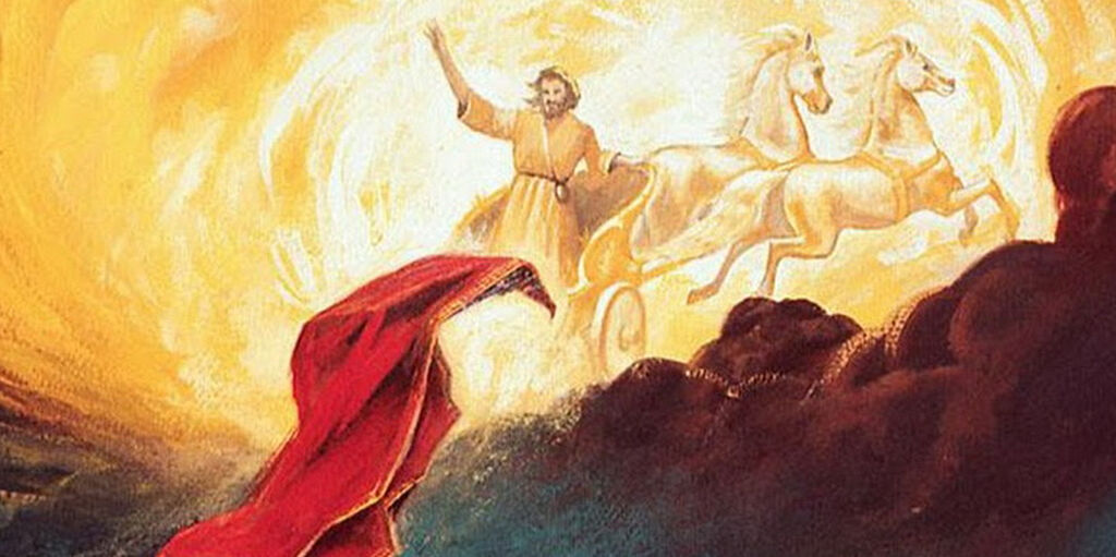 Enquanto os dois continuavam a conversar, um carro de fogo, puxado por cavalos de fogo, desceu do céu e separou os dois homens. Elias foi então arrebatado ao céu em um redemoinho, enquanto Eliseu observava. Enquanto Elias era levado, seu manto caiu, e Eliseu o pegou. Testemunhas oculares, os “filhos dos profetas”, viram o evento e reconheceram que o espírito de Elias repousava sobre Eliseu.