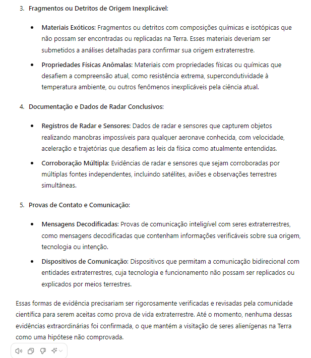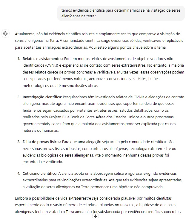 Poderia ter feito mais perguntas ao ChatGPT, até fiz, mas não coloquei aqui para o texto não ficar demasiado longo. Ela até citou vários casos interessantes, mas no final sempre enfatiza que não temos provas definitivas da presença alienígena na Terra.