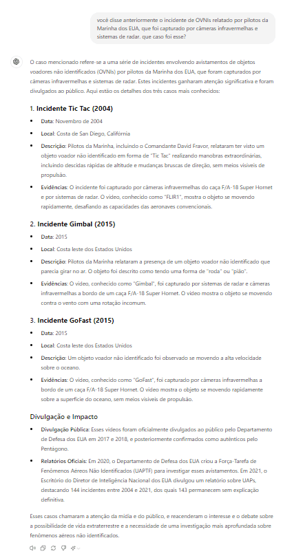 - Detecção por Equipamentos Militares e Científicos: Existem casos em que objetos não identificados foram detectados por sistemas de radar militares ou sensores científicos. Esses dados são mais difíceis de desmentir e muitas vezes são analisados detalhadamente por especialistas. Um exemplo famoso é o incidente de OVNIs relatado por pilotos da Marinha dos EUA, que foi capturado por câmeras infravermelhas e sistemas de radar. Aqui ela está citando os casos Incidente Tic Tac (2004), Incidente Gimbal (2015) e o Incidente GoFast (2015).