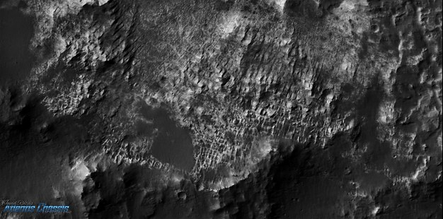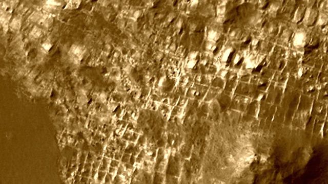 A foto mostra linhas de grade geométricas visíveis com comprimento aproximado de 1km entre as interseções, parecendo ruas. Ao longo dessas “ruas” há arranjos como construções que se parecem com edifícios e torres. Isso poderia indicar uma cidade em ruínas ou pode ser uma rara formação natural.