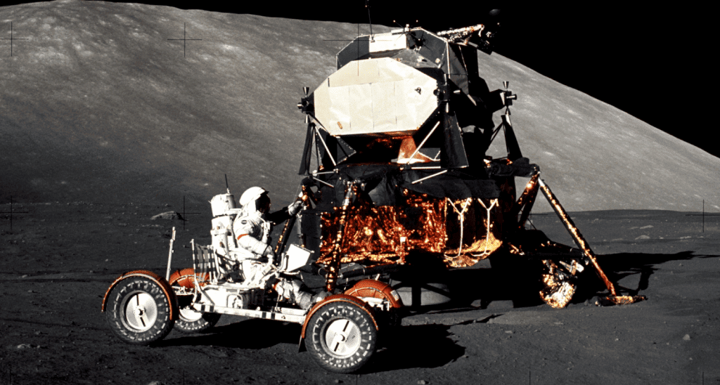 Apollo 15 – Julho de 1971 – David Scott e James Irwin. Primeira missão a usar o Lunar Roving Vehicle (o “jipe lunar”), que permitiu explorar até 27 km do local de pouso.