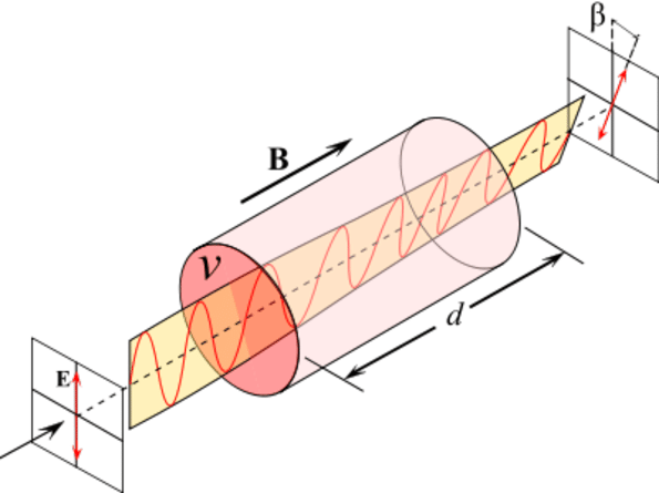 Se você pega um material como um cristal, aplica um campo magnético constante nele e faz a luz atravessar esse material, a polarização da luz (a orientação em que ela vibra) gira um pouco. Isso é o Efeito Faraday.